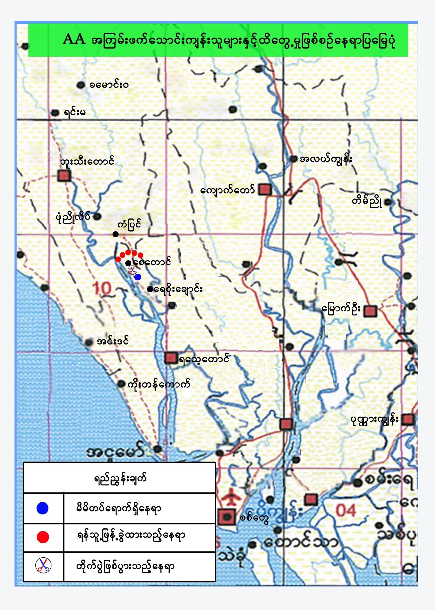 AA အၾကမ္းဖက္ေသာင္းက်န္းသူမ်ားအေနျဖင့္ ၎ကဲ့သုိ႔ ရပ္ကြက္ႏွင့္ ေက်းရြာမ်ားအား အသုံးျပဳ အကာအကြယ္ရယူလ်က္ တပ္မေတာ္လုံၿခဳံေရးစစ္ေၾကာင္းမ်ားအား မုိင္းေထာင္/မုိင္းဆြဲတုိက္ခုိက္ျခင္း၊ ေခ်ာင္းေျမာင္းပစ္ခတ္ျခင္းမ်ားျပဳလုပ္လ်က္ရွိၿပီး လုံၿခဳံေရးတပ္ဖြဲ႕၀င္မ်ားက မလႊဲမေရွာင္သာ ျပန္လည္ ခုခံရသည့္အခါ ရပ္ကြက္၊ ေက်းရြာ မ်ားအတြင္း မလုိလားအပ္ေသာ ထိခိုက္ဆုံး႐ႈံးမႈမ်ားရွိလာႏုိင္သျဖင့္ ရခိုင္ျပည္နယ္အတြင္းရွိ ၿမိဳ႕၊ ရပ္ကြက္ႏွင့္ ေက်းရြာမ်ား၌ AA အၾကမ္းဖက္ေသာင္းက်န္းသူမ်ားအား လက္မခံၾကရန္ႏွင့္ ၿမိဳ႕၊ ရပ္ကြက္ႏွင့္ ေက်းရြာမ်ားအတြင္း၀င္ေရာက္လာပါကလည္း သက္ဆုိင္ရာ အုပ္ခ်ဳပ္ေရးအဖြဲ႕အစည္းမ်ားႏွင့္ လုံၿခံဳေရးအဖြဲ႕အစည္းမ်ားသုိ႔ သတင္းေပးပုိ႔ၾကပါရန္ ေမတၱာရပ္ခံ ထားေၾကာင္း သတင္းရရွိသည္။